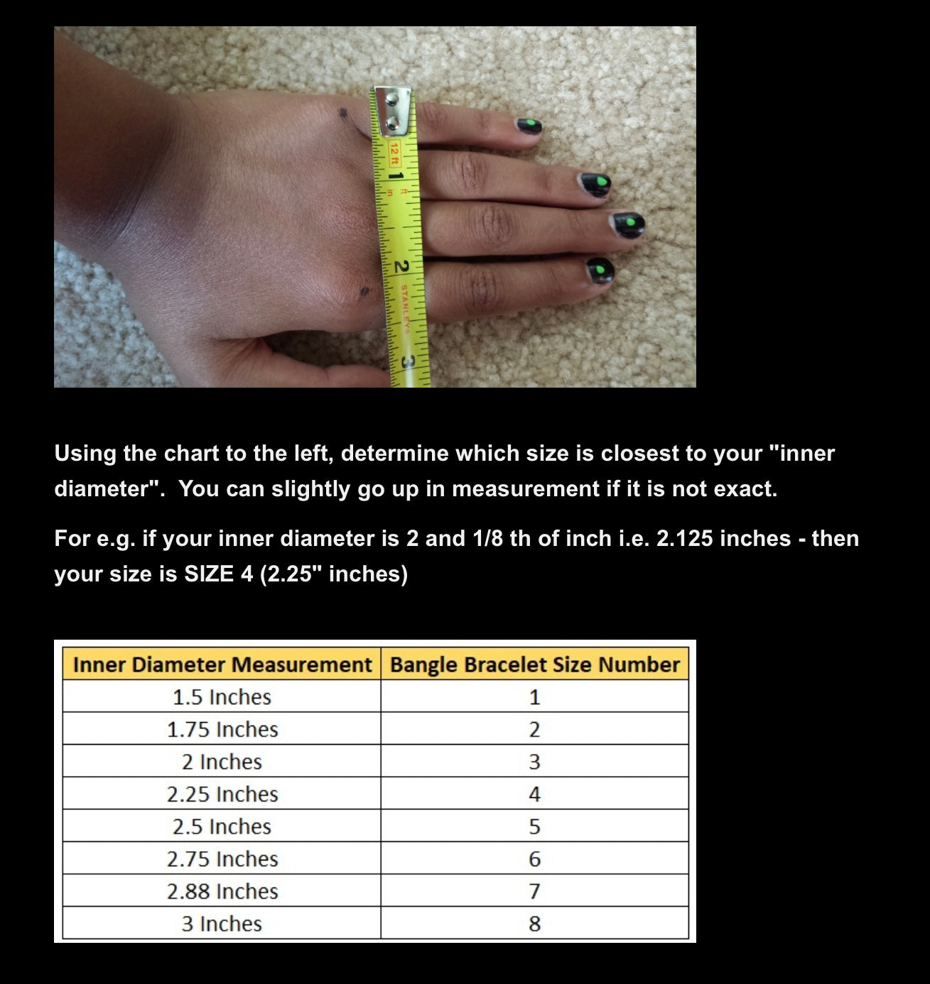 Bangles are sold in different sizes. No one size fits all. The smaller the number the smaller the bangle! Small numbers are for baby/infant, larger numbers for adults starting around Size 5! Please use simple chart inserted in pictures above to measure your bangle size. Use measuring tape (inches) to get your accurate size. Quantity (12) bangles.